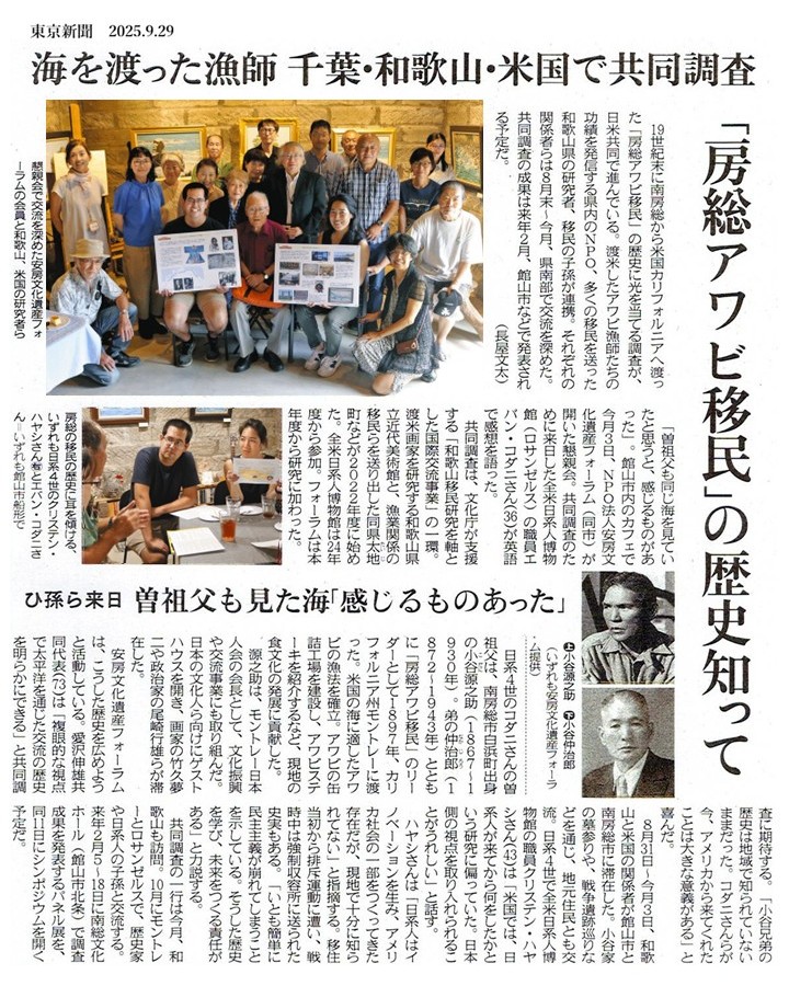 19世紀末に千葉県の南房総から米国カリフォルニアへ渡った「房総アワビ移民」の歴史に光を当てる調査が、日米共同で進んでいる。渡米したアワビ漁師たちの功績を発信する県内のNPO、多くの移民を送った和歌山県の研究者、移民の子孫が連携。それぞれの関係者らは8月末~今月、県南部で交流を深めた。共同調査の成果は来年2月、館山市などで発表される予定だ。(長屋文太)
