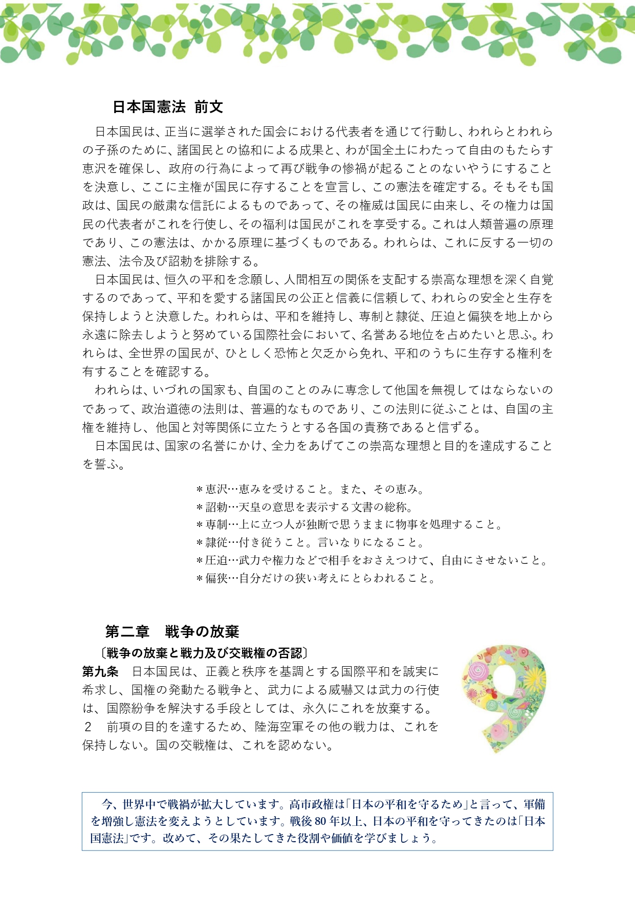 終戦の翌年に日本国憲法が公布されてから80年を迎えます。この憲法のおかげで、日本は戦争をすることなく、平和を維持してきました。今、改憲をめぐる動向と問題点を、私たち一人ひとりが学び、考えることが重要です。誰にでも分かりやすく、解説いただける学習会を企画しました。どうぞお気軽にご参加ください。オンライン視聴もできます。