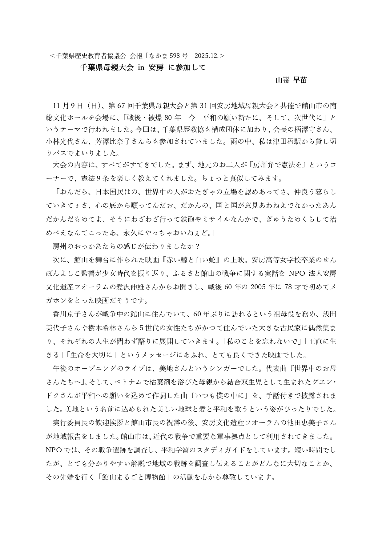 11月9日(日)、第67回千葉県母親大会と第31回安房地域母親大会と共催で館山市の南総文化ホールを会場に、「戦後・被爆80年 今 平和の願い新たに、そして、次世代に」というテーマで行われました。今回は、千葉県歴教協も構成団体に加わり、会長の柄澤守さん、小林光代さん、芳澤比奈子さんらも参加されていました。雨の中、私は津田沼駅から貸し切りバスでまいりました。