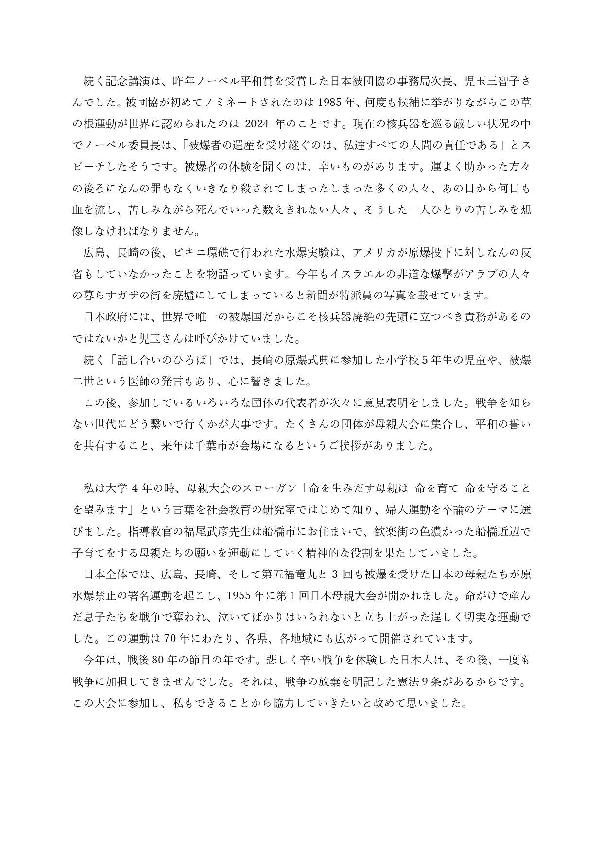 今年は、戦後80年の節目の年です。悲しく辛い戦争を体験した日本人は、その後、一度も戦争に加担してきませんでした。それは、戦争の放棄を明記した憲法9条があるからです。この大会に参加し、私もできることから協力していきたいと改めて思いました。