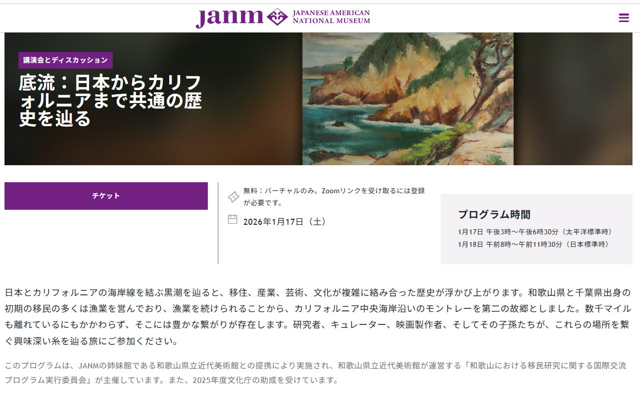 このプログラムは、2025年度文化庁の助成事業として、和歌山県立近代美術館が運営する「和歌山における移民研究に関する国際交流プログラム実行委員会」が主催し、NPO法人安房文化遺産フォーラム、和歌山県太地町教育委員会、全米日系人博物館(JANM)が連携しています。