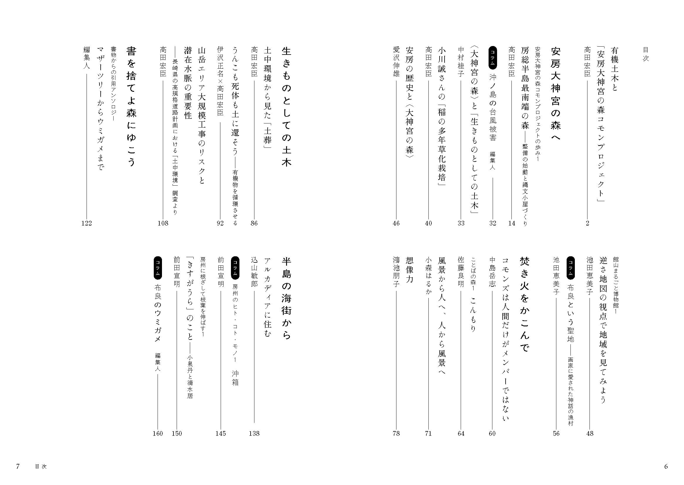 高田宏臣/愛沢伸雄・池田恵美子(NPO法人安房文化遺産フォーラム共同代表) /伊沢正名(糞土師)/鴻池朋子(アーティスト)/込山敏郎(サンドカフェ店主)/小森はるか(映像作家)/佐藤良明(翻訳家・エッセイスト)/中島岳志(政治学者)/中村桂子(生命誌研究者)/前田宣明(北条文庫店主)